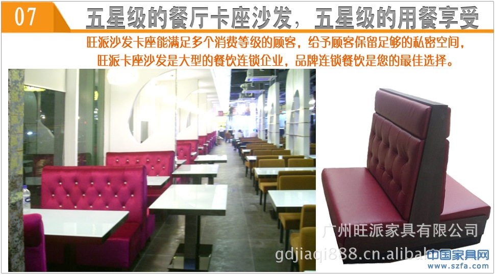 广东旺派家具有限公司是广东著名家具企业,经过广州市工商局注册的企业.广东生产基地位于享有国际家具商贸之都美誉的佛山市顺德区,在国内拥有30000平方米的厂房和一流的生产设备,各类技术管理及高级技师等500多人,在国外有10000于平方米的工厂,200多名工人。广东旺派家具有限公司主要从事餐饮家具的研发、生产、销售、服务和外贸出口以及品牌经营为一体的大型实业公司,是一家致力于餐饮家具服务领域中具有高度专业性的现代化服务行业领跑者.主要生产经营餐厅卡座沙发,麦当劳卡座沙发,肯德基卡座沙发,必胜客卡座沙发桌椅,茶餐厅卡座沙发桌椅,西餐厅卡座沙发桌椅,咖啡厅桌椅沙发,快餐厅桌椅沙发,专业为客户提供完善的产品设计、工程设计方案、售后服务,旺派卡座沙发成功将卡座沙发皮革耐磨的使用寿命延长3倍以上,为满足全国各地的需求,现我厂推出全国范围内免费专线物流送货上门.